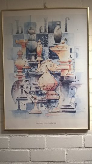 We hebben een prettige avond gehad bij Saende met een prettige speelzaal met goed schaakmateriaal en een goede ambiance. De speelzaal werd versierd met, uiteraard, een veelheid van schaak-trofeeën, maar ook met foto’s van enkele grootmeesters en drie prenten die schaakgerelateerd waren.