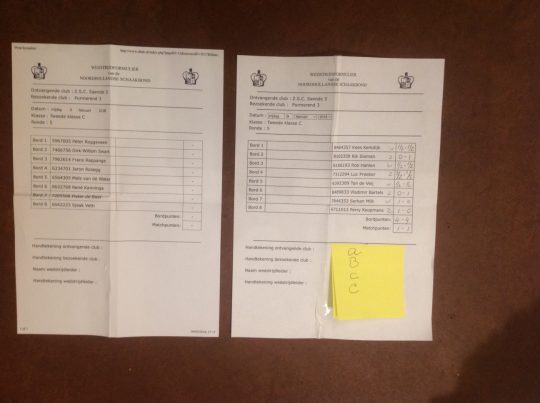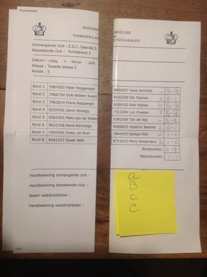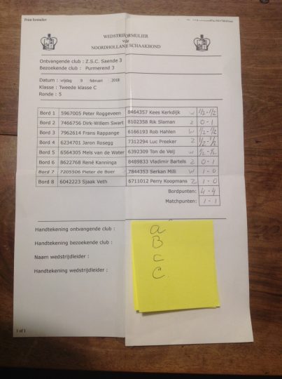 Bij de NHSB competitie-wedstrijd ZSC-Saende 3-Purmerend 3 bracht ik een idee in praktijk teneinde schrijfwerk, nl. het invullen van het Wedstrijdformuilier van de Noordhollandse Schaakbond, te vermijden. Het idee sloeg direct aan bij de teamleider van Saende, mede omdat hij al het schrijfwerk had moeten doen. Nu volstond enig gezamenlijk Fröbelwerk.
