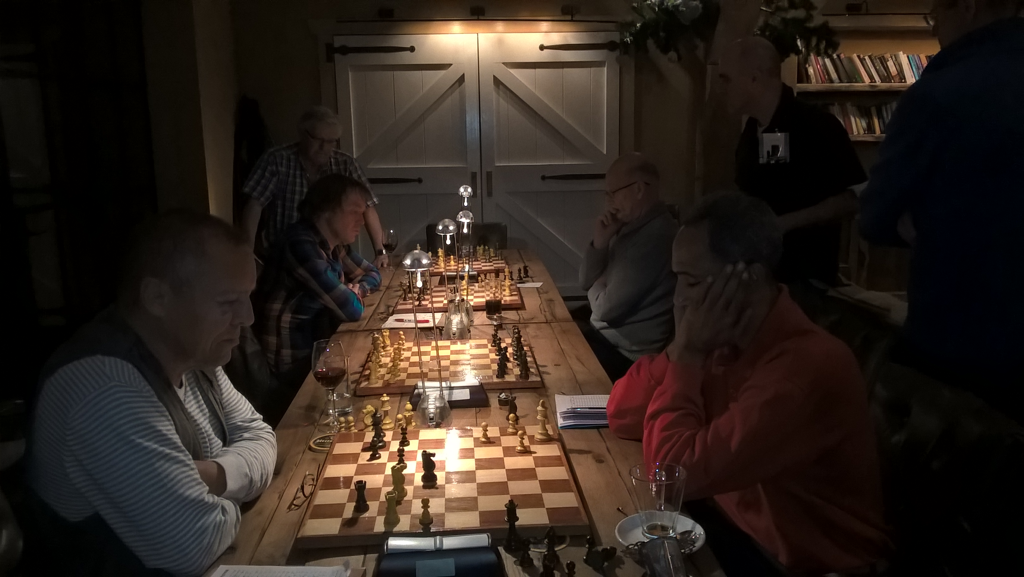 Met invaller Peter Kniestedt voor André Stoelendreyer werd 1 december de reis ondernomen naar Bakkum om aldaar tegen de torenhoge favoriet aan te treden. Bakkum had inmiddels hun vertrouwde speellocatie hotel Borst verruild voor restaurant Het Ruiterhuys, wat een prachtige verbouwde boerderij bleek te zijn compleet met paarden, schapen en een geregeld luid kukelende haan. Na anderhalf uur spelen moest Gerard Lonnee z’n koning omleggen. Ergens onderweg was hij een stuk kwijtgeraakt en werd resoluut van het bord geschoven. Was Cor ten Woude in de vorige ronde diegene die als enige de Purmerendse eer wist hoog te houden, ook nu had hij een plezierige stelling weten op te bouwen met een stuk voor twee pionnen. Gezien het ratingverschil van 469 deed Cor een remiseaanbod wat door z’n tegenstander met tegenzin toch maar werd aangenomen. We hebben Cor inmiddels in het team gebombardeerd tot “the ratingkiller”. Op het 2e bord was inmiddels de druk op mijn koningsstelling tot het kookpunt gestegen en met kunst en vliegwerk kon ik een dreigend mat voorkomen. Dit koste echter zoveel materiaal dat ik even later inzag dat verder spelen geen enkele zin meer had. Gerard Jongen had inmiddels een eindspel bereikt met allebei een toren + vier pionnen. De vier van z’n tegenstander waren allen verbonden maar Gerard had er één die zich vrijgevochten had, een handenbindertje dus. Ondanks ook hier het enorme ratingverschil van 547 koos Gerard’s tegenstander eieren voor zijn geld en accepteerde zijn remiseaanbod. Bleef over de partijen van Jaap Poel en Peter Kniestedt op de borden 1 en 5. Peter wist met zijn dame de vijandelijke koningsstelling binnen te dringen en joeg deze, onderweg een pionnetje consumerend, op naar de andere zijde van het bord. Wat overbleef was een eindspel van dame + 5 pionnen tegen dame + 4 pionnen. Peter had echter zoveel minder tijd als zijn tegenstander dat hij een winstpoging niet zag zitten en het remiseaanbod van zijn tegenstander gretig accepteerde. Als laatste was Jaap nu nog bezig. In een razend ingewikkeld middenspel wist hij met 2 pionnen minder zijn tegenstander met een matdreiging danig hoofdbrekens te bezorgen. Dit kostte zoveel tijd dat het nog maar de vraag was of het materiele voordeel binnen de vlag verzilverd zou kunnen worden. Dit lukte uiteindelijk toch maar prima gespeeld Jaap. Ik heb je tegenstander meerdere malen diep horen zuchten. Al met al was dit een memorabel avondje schaken op een memorabele locatie. We hebben onze huid duur verkocht mannen!