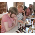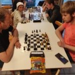 Aansluitend aan het avondeten het volgende schaakonderdeel: de schaaksimultaan. Ook dit jaar weer gegeven door onze IM, Pieter Hopman. Er wordt steeds meer tegenstand gegeven, maar met slechts een verlies partij leverde Pieter ook dit keer weer een knappe prestatie. Hij moest alleen het onderspit delven tegen Romayn die zijn vrijpion kon laten promoveren. Petje af voor beide. Daarna nog de nodige spellen spelen en slapen. Iets meer slaap dan de voorgaande nacht.